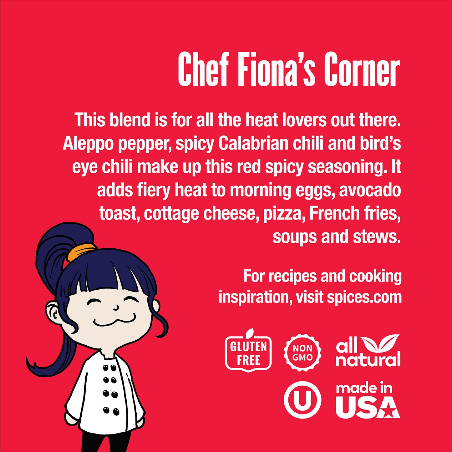 This blend is for all the heat lovers out there. Aleppo pepper, spicy Calabrian chili and bird’s eye chili make up this red spicy seasoning.